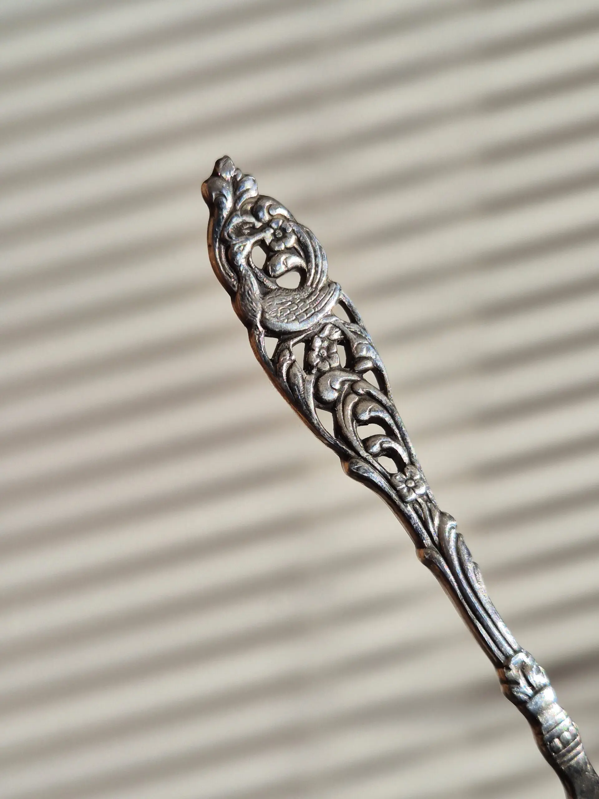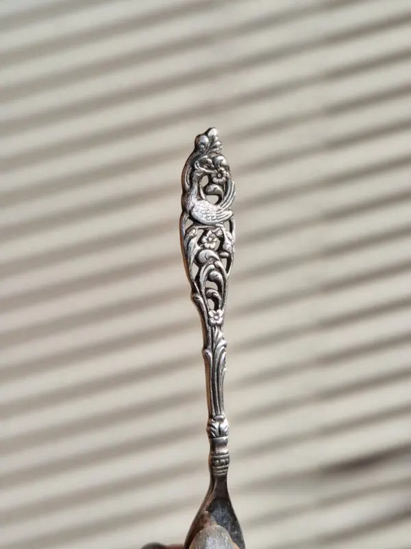 Een lepel met prachtige kraanvogel en bloemen details klaar om te worden omgetoverd tot ring die je altijd bij je kan dragen